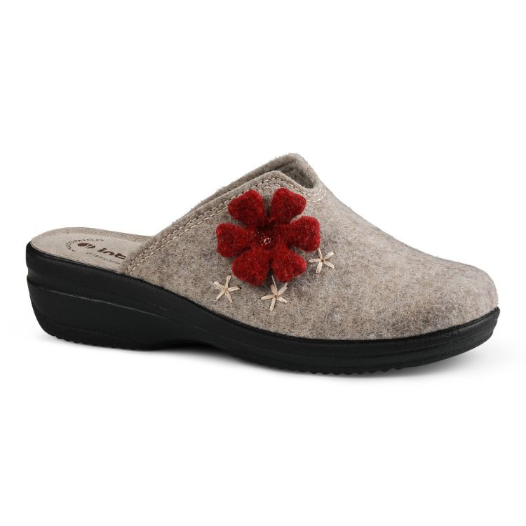Comode pantofole con leggera zeppa e applicazione a fiore. Hanno un comodo plantare di pelle imbottito.