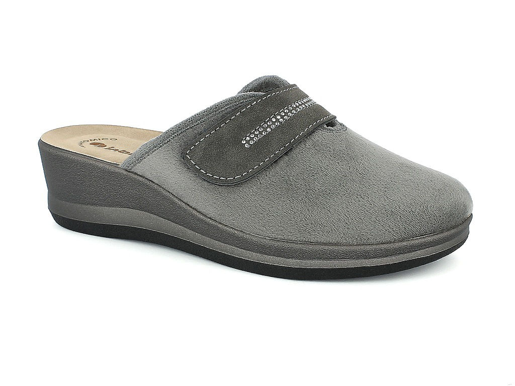 Eleganti pantofole effetto velluto con chiusura a strappo con brillantini. Adatte sia ad ambiente interni che esterni.