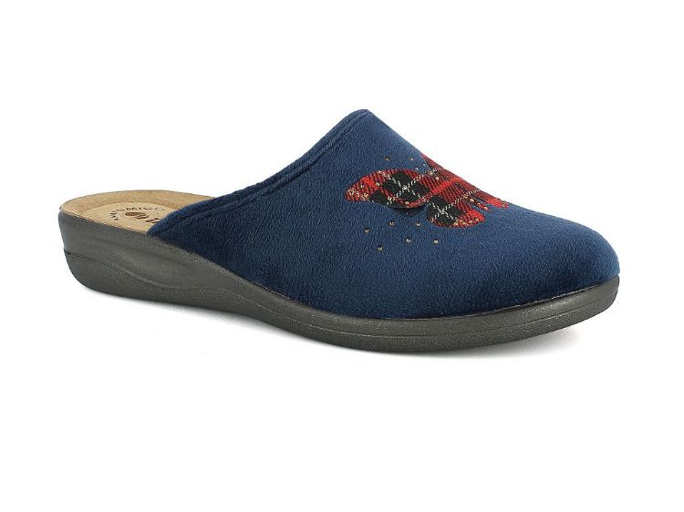 Pantofole con farfalla a fantasia tirolese e strass. Sottopiede in pelle. Il leggero tacco aiuta a mantenere una postura ideale.