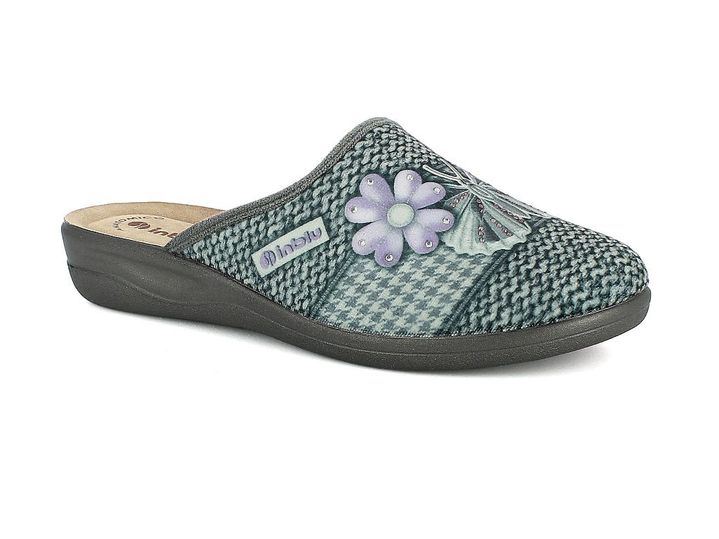 Pantofole con giocosa immagine di fiore e farfalla su trama di lana. Il leggero tacco aiuta a mantenere una postura ideale.