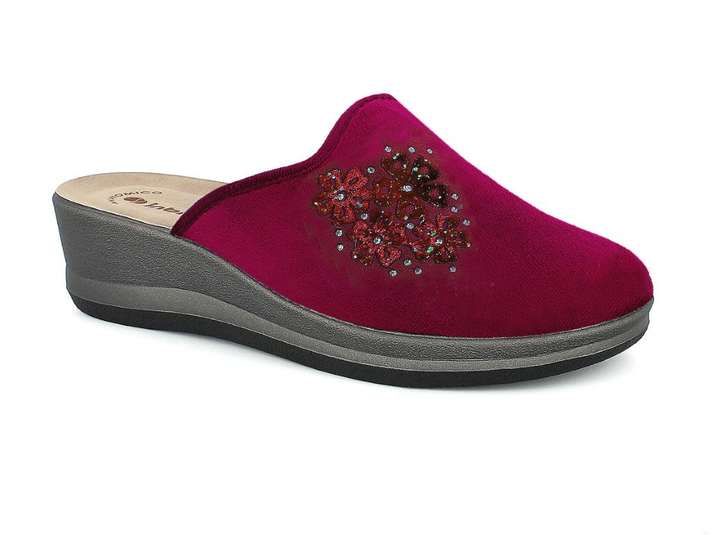 Pantofole con delicato decoro a fiori e brillantini. Adatte sia ad ambiente interni che esterni.
