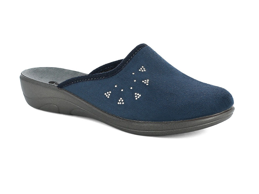 Calde pantofole invernali con tomaia in morbido tessuto e brillantini. Il leggero tacco aiuta a mantere la postura corretta.