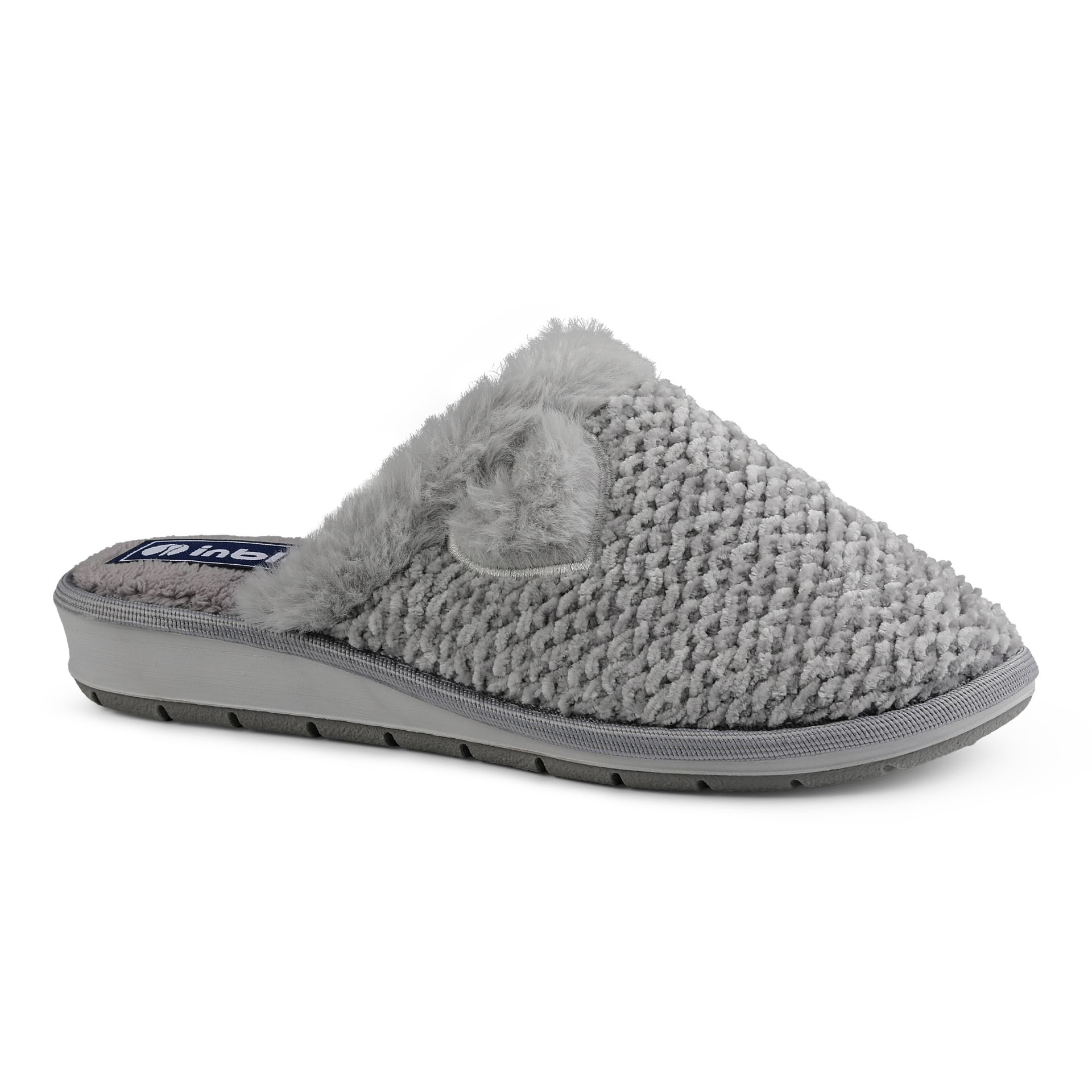 Calde pantofole con trama effetto lana e cuore. Hanno una suola leggera e un tacco di tre centimetri.