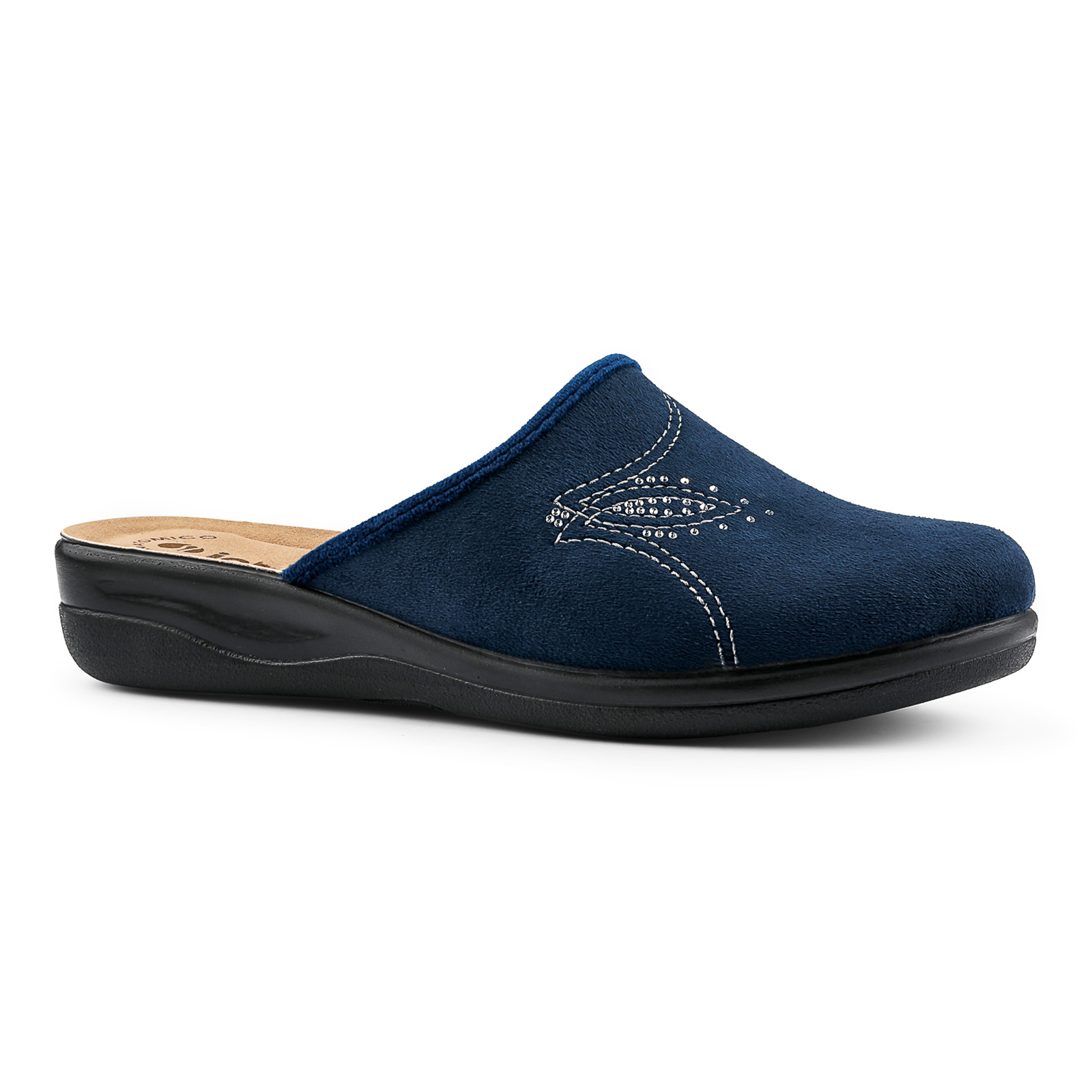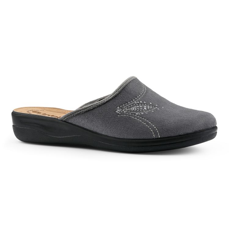 Originali pantofole con decoro realizzato con semplici linee stilizzate e piccoli brillantini.Il plantare anatomico è in ecopelle imbottita e la suola poliuretanica ha un leggero rialzo che aiuta a mantenere una postura comoda.