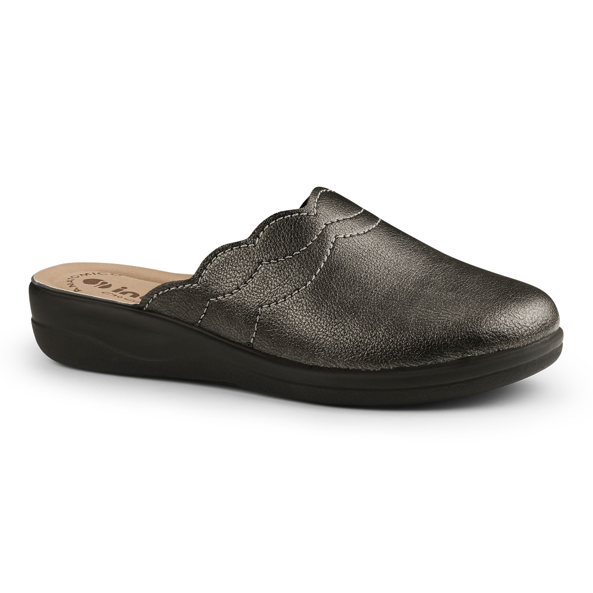 Pratiche pantofole in ecopelle semplici ed eleganti. Leggero tacco e plantare anatomico.