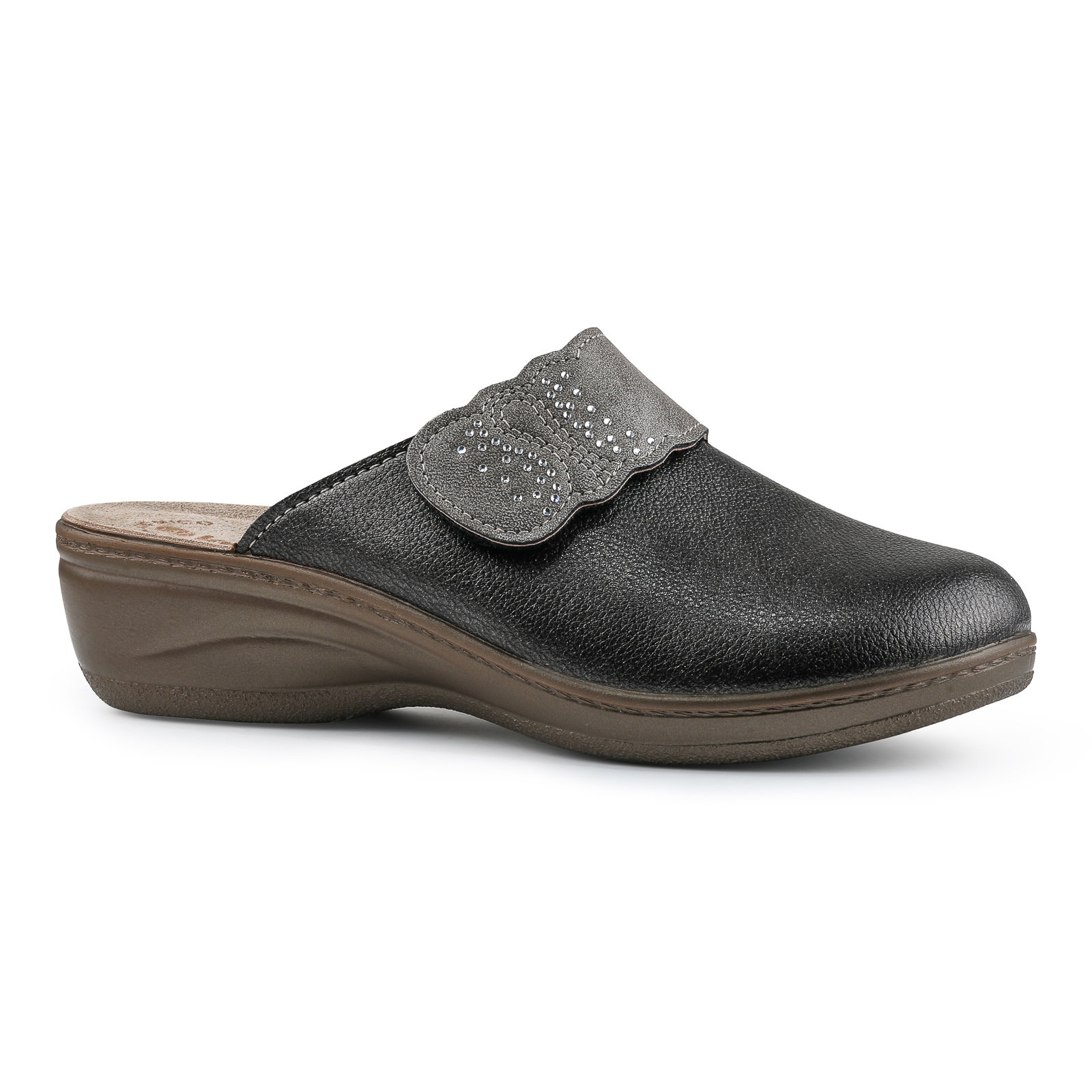 Pantofole con pratica chiusura a strappo con brillantini e plantare in vera pelle.