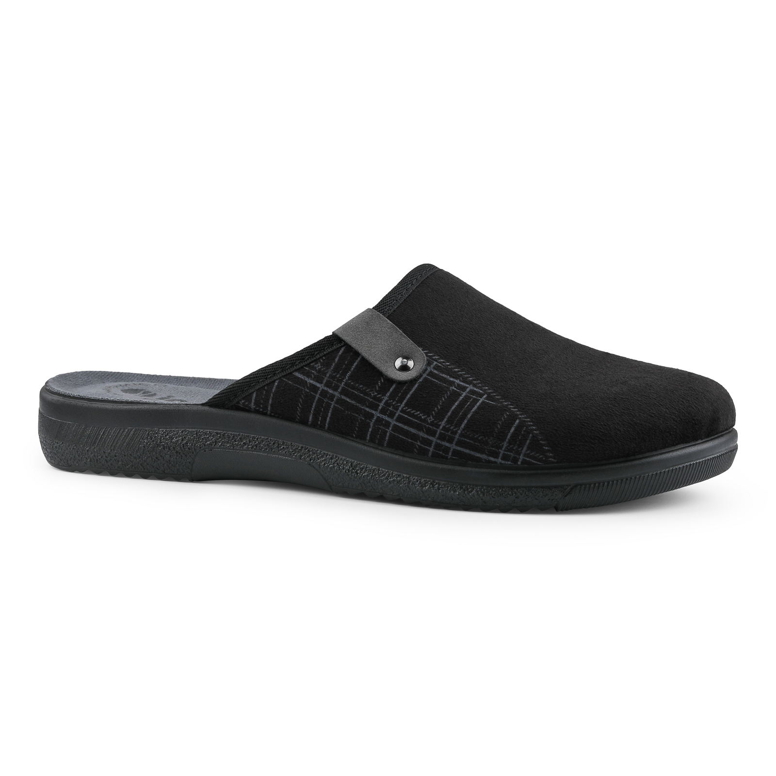 Pantofole da uomo dalla linea semplice e pulita, eleganti e sfiziose con inserto in tartan.Il plantare anatomico è in morbido tessuto e la suola poliuretanica rende queste pantofole adatte sia per interno che per esterno.