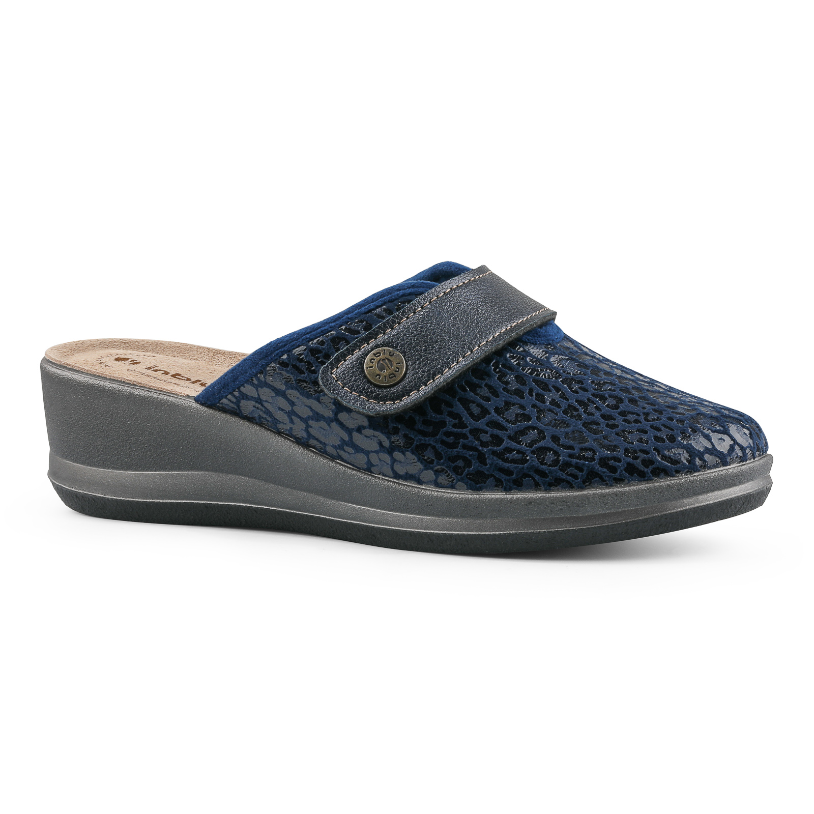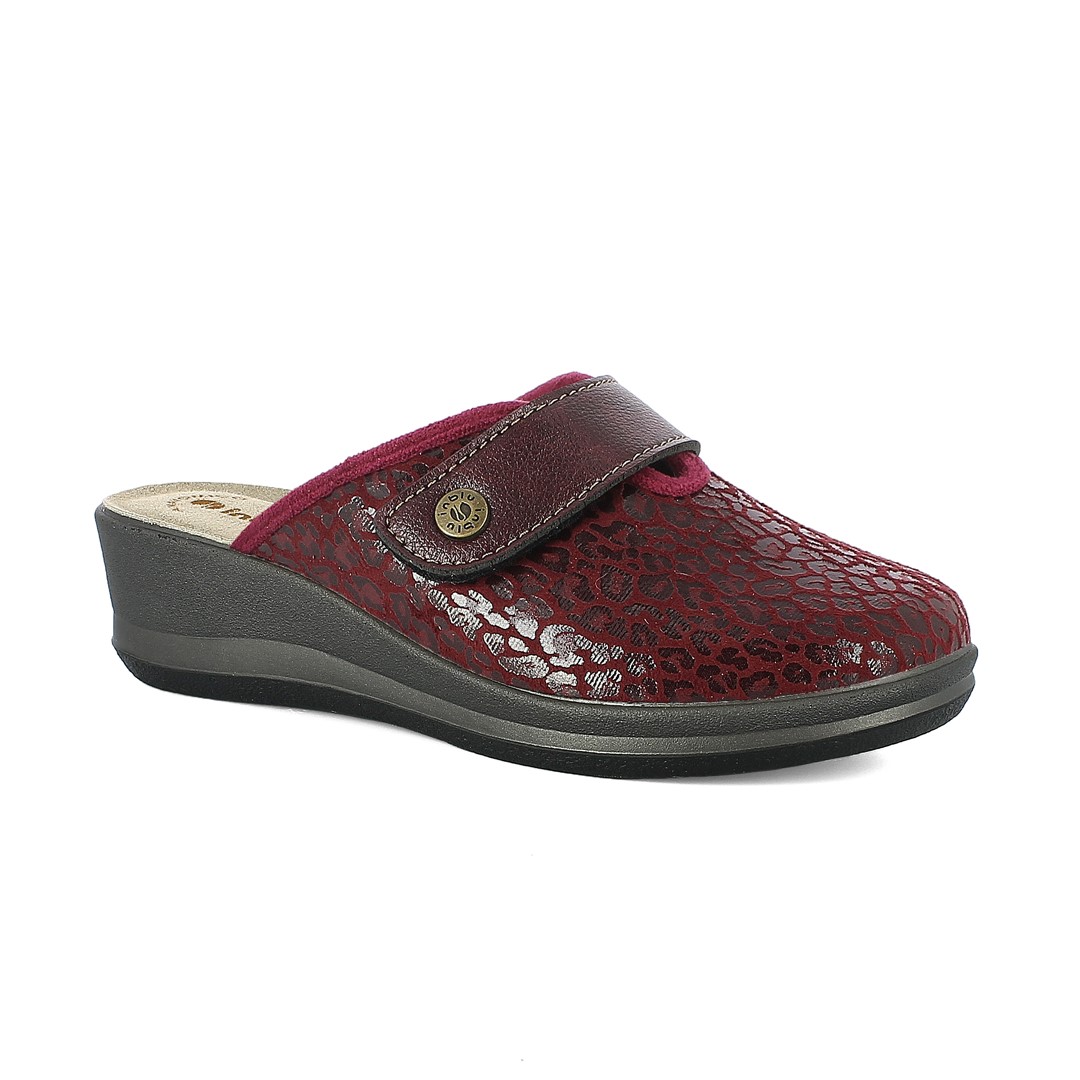 Pantofole con fantasia leoparadata, pratica chiusura a strappo e plantare in vera pelle.