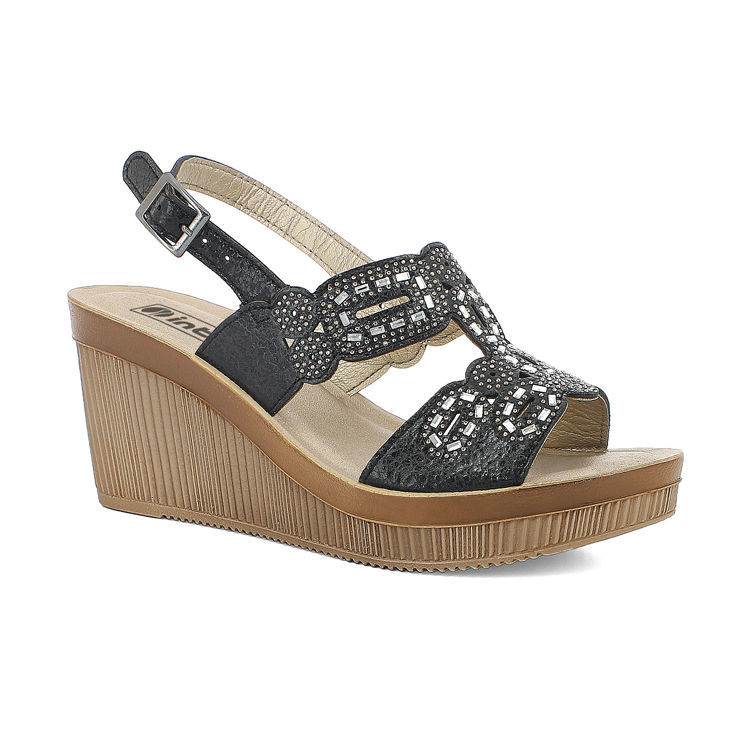 Il cinturino mantiene il piede saldamente ancorato, mentre la leggerissima zeppa e il plateau permettono una camminata spedita. Per una coccola extra il plantare è in morbida ecopelle imbottita.I sandali, decorati con motivi geometrici impreziositi da piccoli strass, sono perfetti da indossare sia con maxi abiti leggeri che con un bel pantalone largo!
