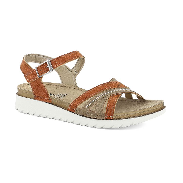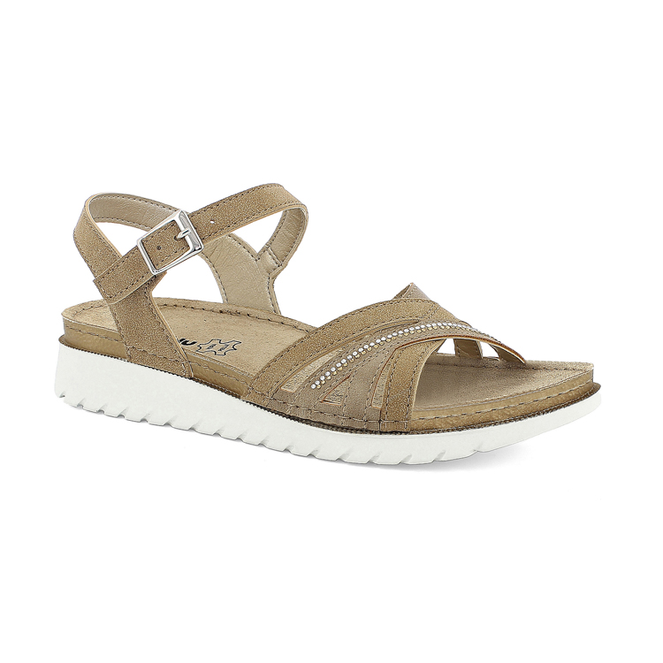 Sandali bicolore effetto cucito con cinturino regolabile e sottile strisce di brillantini. Plantare in pelle imbottito.