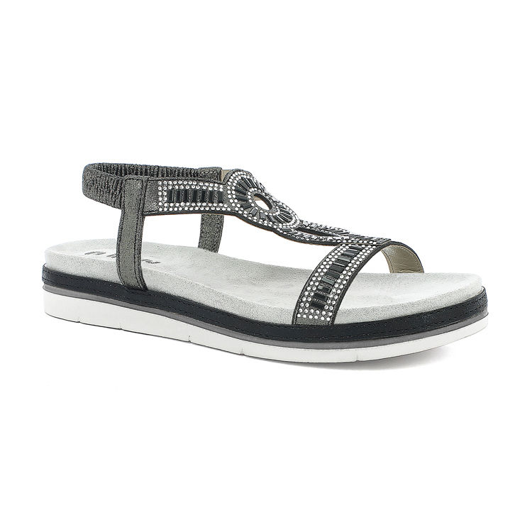 Sandali bassi con leggerissima suola e decoro in strass con cerchi che esaltano il collo del piede. La chiusura ad elastico permette un indosso veloce. Il plantare in tessuto garantisce un contatto con il piede piacevole.
