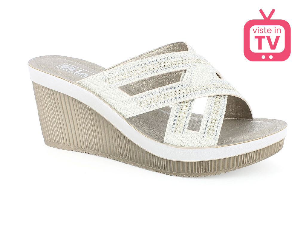 La zeppa è leggera grazie al materiale poliuretanico che rende ogni tuo passo confortevole.Le fasce incrociate sono abbellite da brillanti strass.