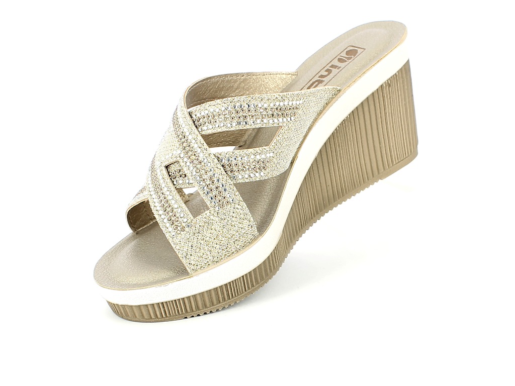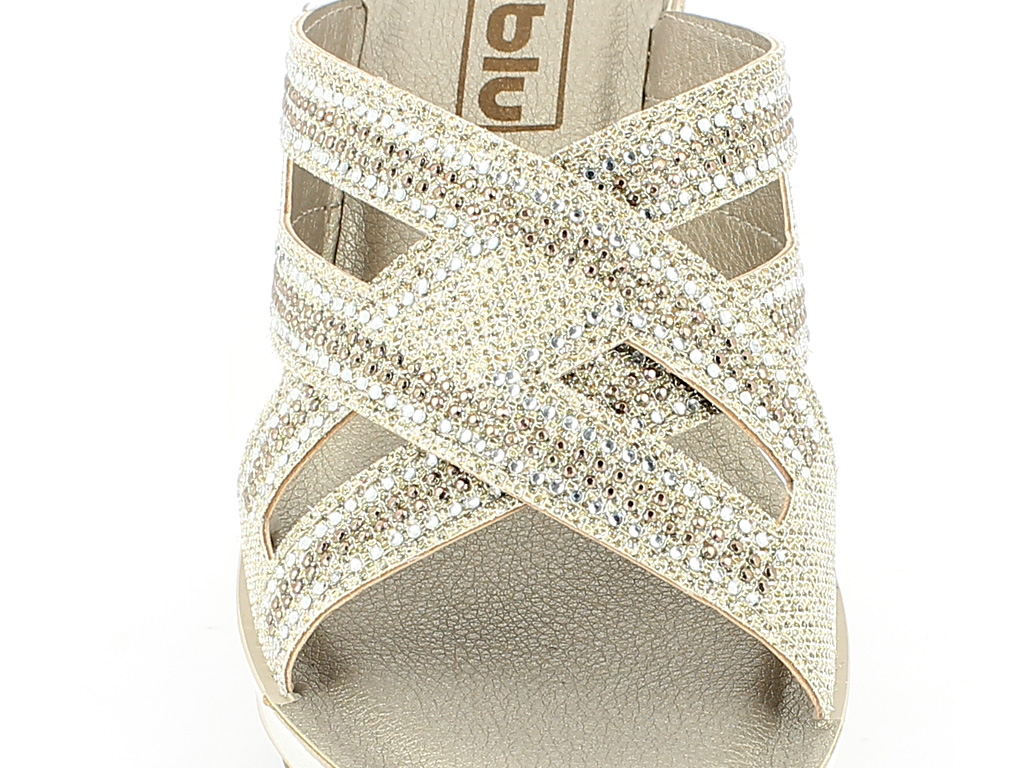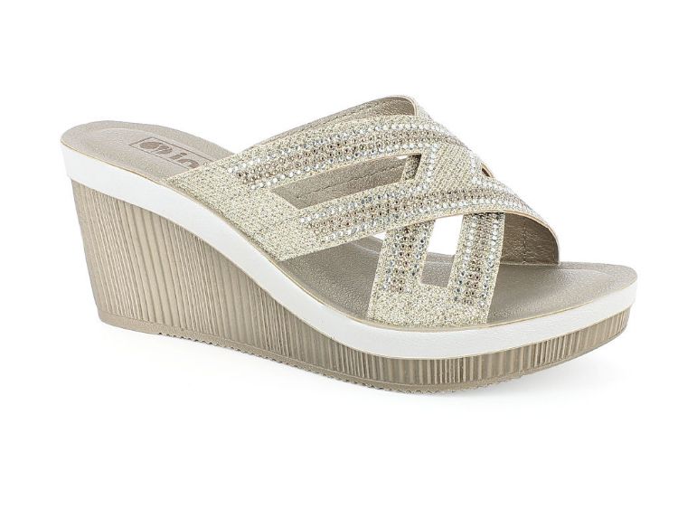 La zeppa è leggera grazie al materiale poliuretanico che rende ogni tuo passo confortevole.Le fasce incrociate sono abbellite da brillanti strass.