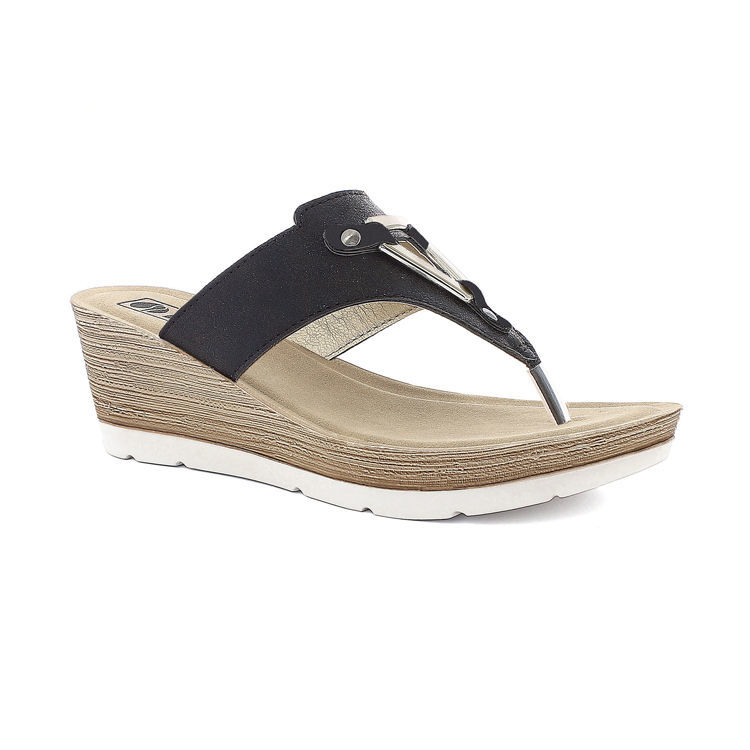 Infradito con zeppa e fibbia. Plantare morbido imbottito.