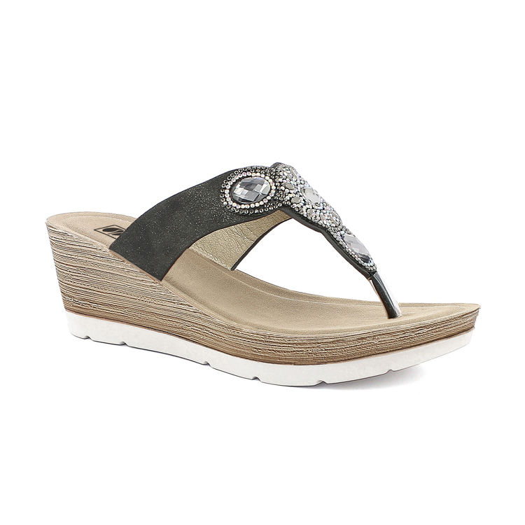 Stai cercando un'originale infradito? L'hai trovata! Con perline, comodo plantare imbottito e zeppa con plateau che facilita una camminata spedita.Questa calzatura elegante è ideale da abbinare ad un maxi abito leggero.