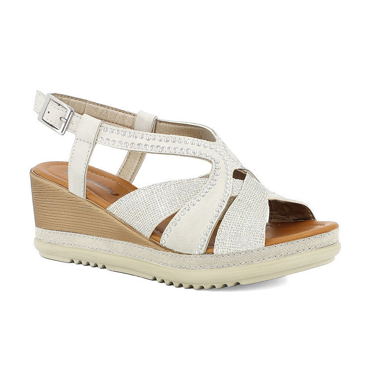 Comodi sandali a zeppa con cinturino regolabile e brillantini.
