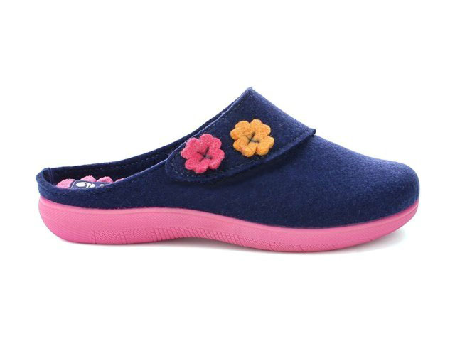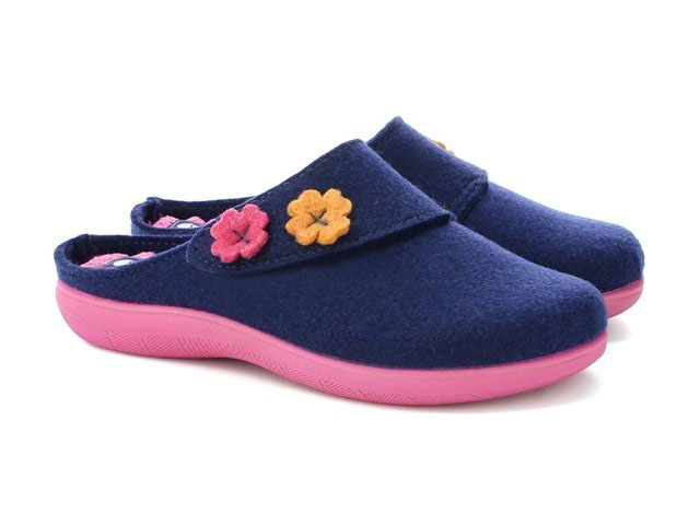 Comode pantofole da donna realizzate in feltro reciclato prodotto in Italia. Sottopiede imbottito in tessuto ondulato e velcro regolabile.