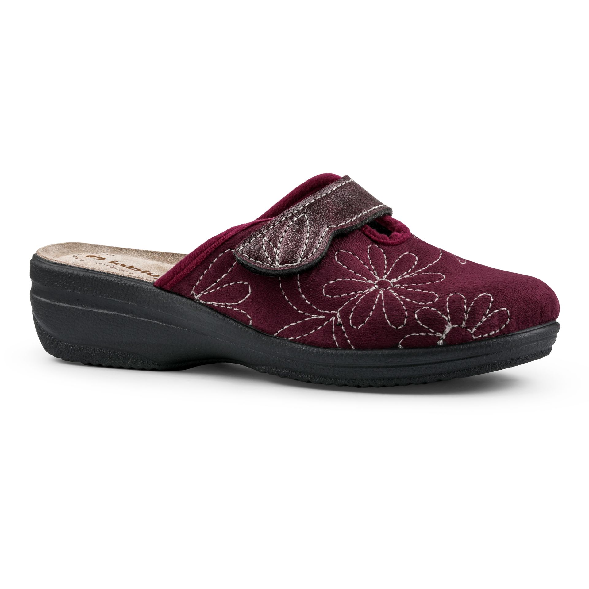 Pantofole con chiusura a strappo regolabile e decoro fiorato. Hanno un plantare in vera pelle imbottito.